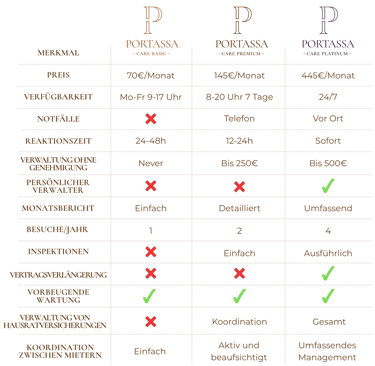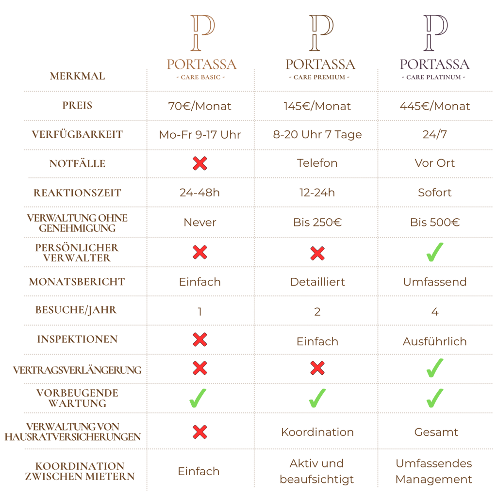 Vergleichstabelle zwischen den verschiedenen Portassa Care-Tarifen