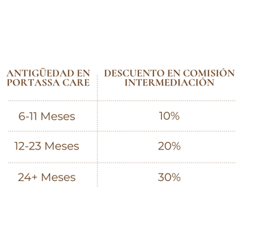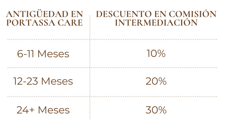 Su compromiso con nosotros es nuestro compromiso con usted. Cuanto más tiempo esté con Portassa Care, mayor será su descuento en la comisión de intermediación para nuevos inquilinos.