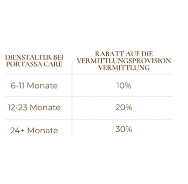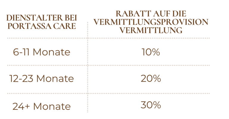 Ihr Engagement für uns ist unser Engagement für Sie. Je länger Sie bei Portassa Care sind, desto größer ist Ihr Rabatt auf die Vermittlungsprovision für neue Mieter.
